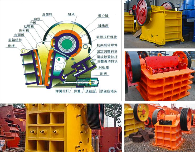 顎破的結(jié)構(gòu)主要有機(jī)架、偏心軸、大皮帶輪、飛輪、動顎、側(cè)護(hù)板、肘板、肘板后座、調(diào)隙螺桿、復(fù)位彈簧、固定顎板與活動顎板等組成,其中肘板還起到保險作用。